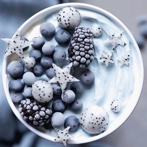 chuối đông lạnh và sữa, hạnh nhân. Topping với dâu tây, hạt salba, dâu,