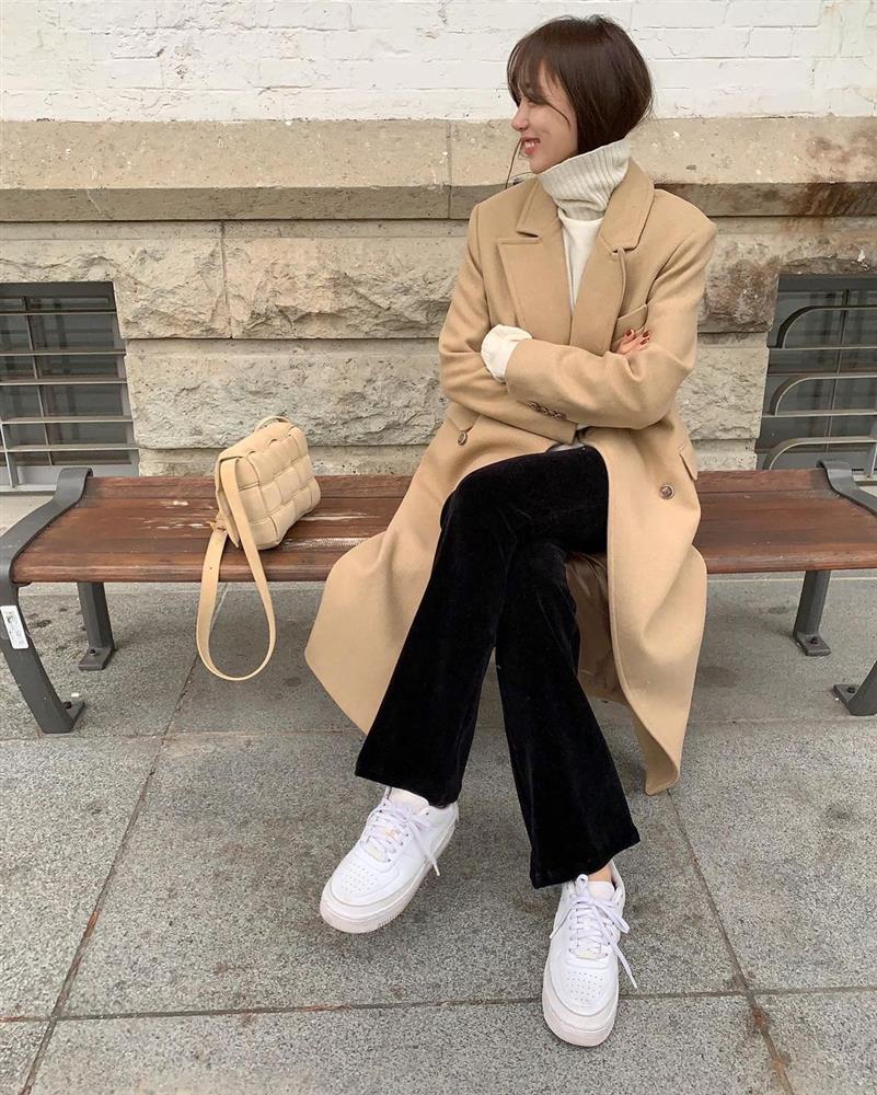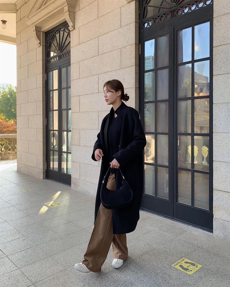 Miền bắc đang bước vào một đợt không khí lạnh mới và lúc này, áo khoác dài rõ ràng là một lựa chọn vô cùng "hợp tình hợp lý". Những kiểu áo khoác dài như áo dạ, áo trench coat sẽ đảm bảo cho bạn một set trang phục ấm áp, và còn rất thời thượng. Để tăng thêm phần phóng khoáng và sành điệu cho bộ đồ, chị em hãy layer bên trong một chiếc áo len/áo cổ lọ, sau đó diện quần ống rộng. Cuối cùng, một đôi sneaker trắng là lựa chọn hoàn hảo để kết lại bộ đồ. Sneaker trắng rất hợp với vẻ phóng khoáng của outfit, nhưng vẫn đảm bảo sự thanh lịch, hợp lý để áp dụng từ công sở ra phố.
