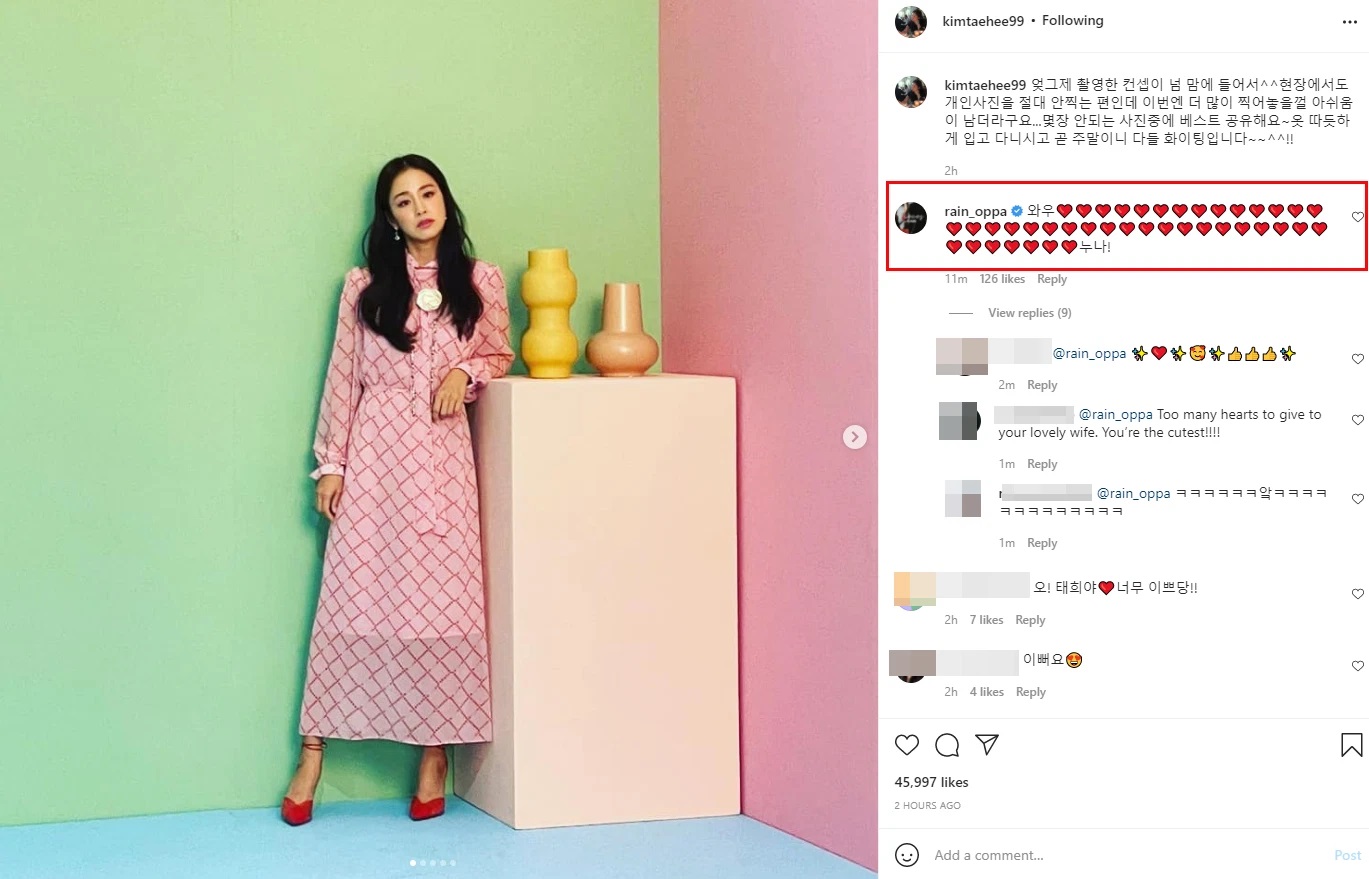 Đáng chú ý, ngay dưới bài đăng của vợ, Bi Rain đã lập tức "thả" loạt trái tim đỏ kèm dòng chữ: "Wow, chị gái". Cách gọi vợ bằng từ chị gái của Bi Rain khiến cộng đồng mạng thích thú. Ai cũng biết, Kim Tae Hee lớn hơn ông xã Bi Rain 2 tuổi, nhưng mọi người vẫn cảm thấy buồn cười khi "ông hoàng Kpop" lại gọi vợ như vậy. Không chỉ năng khen vợ đẹp, Bi Rain còn thường xuyên dành thời gian đưa vợ ra ngoài hẹn hò riêng, hay đi thưởng thức món ăn mới, rồi ngắm hoa…