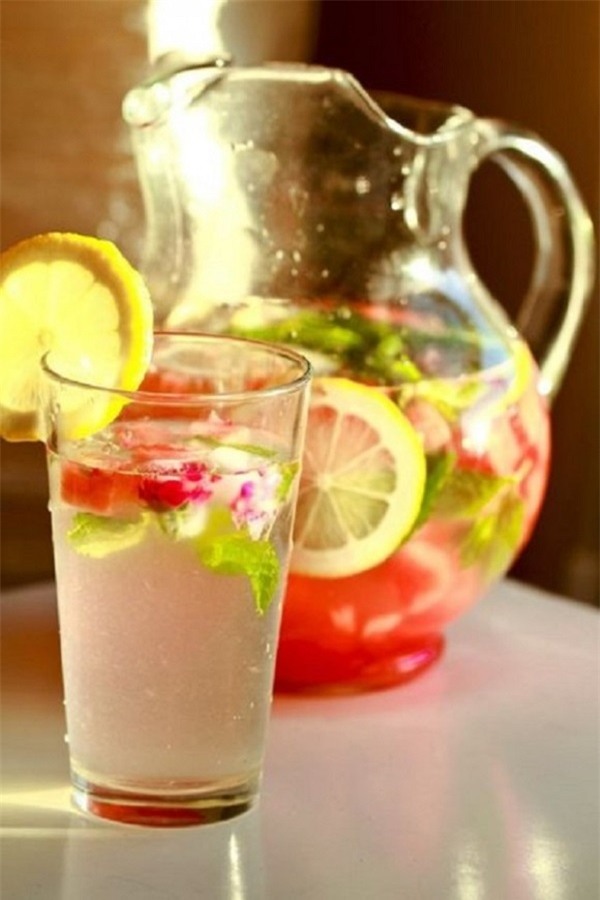Dưa hấu cắt thành miếng nhỏ, chanh thái lát (khoảng 3 lát), lá bạc hà rửa sạch. Sau đó cho tất cả hỗn hợp vào 2 lít nước nguội đóng vào bình rồi cho tủ lạnh uống thay nước lọc cả ngày. Chú ý đừng cho quá chua ảnh hưởng tới dạ dày của bạn.