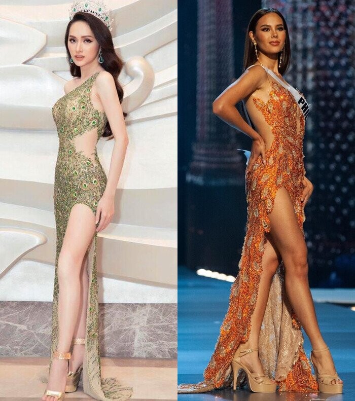 Chiếc váy chim công nổi tiếng mà Miss Universe 2018 - Catriona Gray từng mặc cũng được Hương Giang "lấy cảm hứng" với thiết kế tương tự, cả hai giống nhau đến 80%.