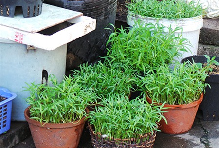 Không khó để bắt gặp hình chậu rau xanh nằm trước ban công, bên hàng rào, thậm chí nằm ngay sát mép đường. Mọi khoảng trống đều được người dân thành phố tận dụng để tự “sản xuất” rau sạch. Trong một con hẻm ở đường Trần Thánh Tông (phường 15, quận Tân Bình), rất nhiều loại rau được trồng trong thùng xốp. Loại rau được người dân nơi đây ưa thích nhất là rau mầm và rau muống trắng.