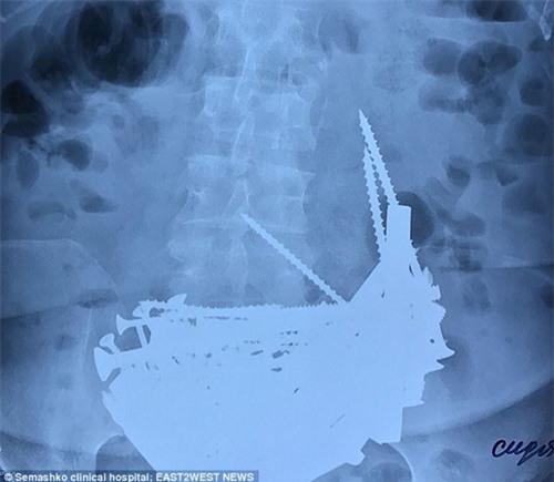 Các bác sĩ đã tiến hành phẫu thuật và lấy ra rất nhiều đinh dài, ốc vít, bu lông, chốt cửa... có cái dài đến hơn 15cm. Thậm chí còn có cả một chiếc vòng bạc.