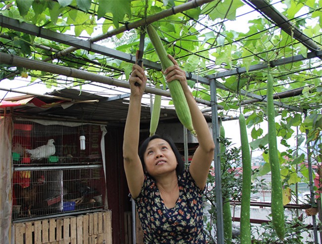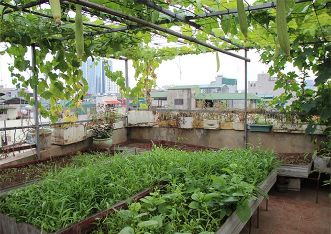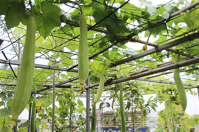 Sau một thời gian, thấy vợ quyết tâm và có được lứa rau đầu xanh ngon, anh quyết định dỡ phần mái tôn để có mặt bằng trồng rau. Không chỉ thế, anh còn làm khung thép và đan lưới để làm giàn cho bầu bí, mướp.