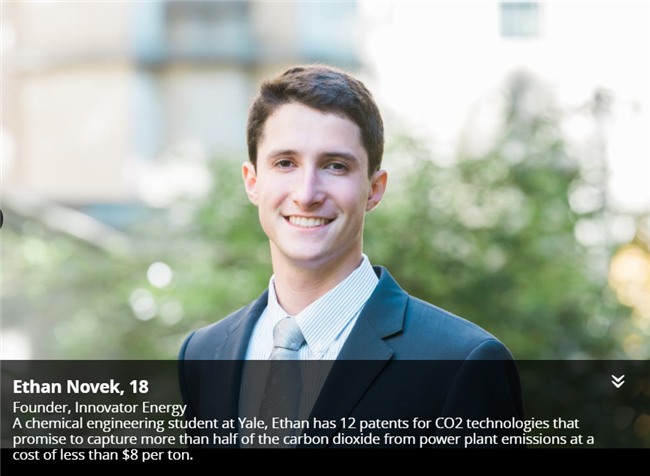 Đáng nể hơn, Ethan Novek mới 18 tuổi nhưng đã sở hữu 20 tấm bằng sáng chế về công nghệ CO2 giúp thu hồi khí thải carbon từ các nhà máy điện với chi phí rất thấp (8 USD/tấn).Novek đã được tạp chí Forbes vinh danh top 30 người trẻ năm 2018.