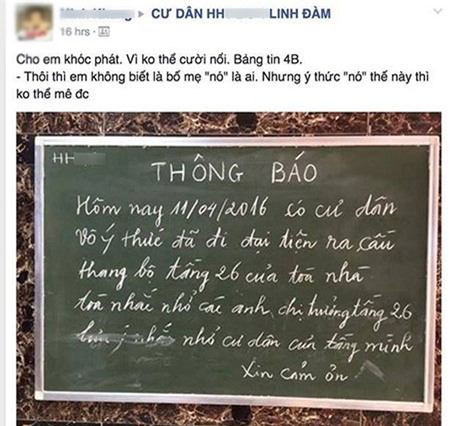 Theo những hình ảnh chụp lại bảng tin của tòa chung cư thì sự việc cụ thể như sau: “Hôm nay ngày 11/4/2016, có cư dân vô ý thức đã đi đại tiện ra cầu thang bộ tầng 26 của tòa nhà, các anh chị trưởng tầng 26, nhắc nhở cư dân tầng của mình. Xin cám ơn”.