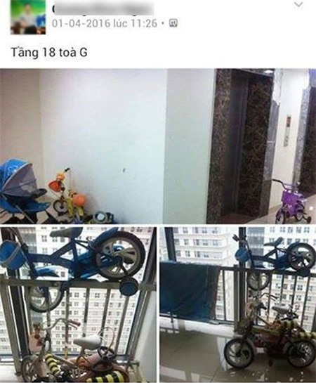 Những chiếc xe này được cài tạm bợ trên ô cửa chung. Nếu chẳng may xe bị rơi từ tầng cao xuống đất thì không biết sẽ gây ra hậu quả gì (ảnh chụp màn hình tại một group kín của cư dân chung cư).