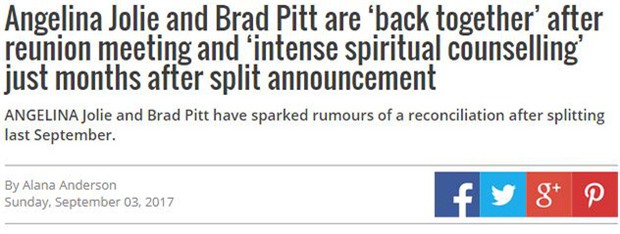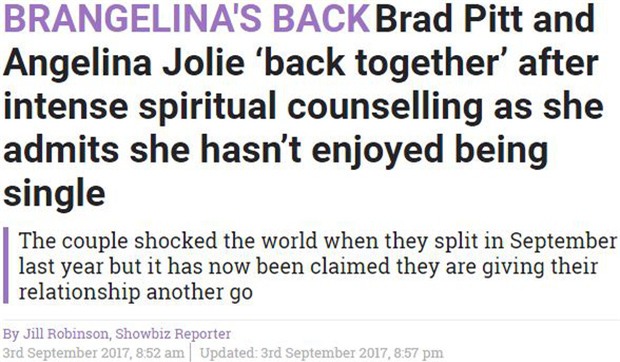 "Brangelina đã quay lại - Brad Pitt và Angelina Jolie trở về với nhau sau quá trình cố vấn tinh thần căng thẳng, cô ấy cũng thừa nhận rằng không thích cuộc sống độc thân"