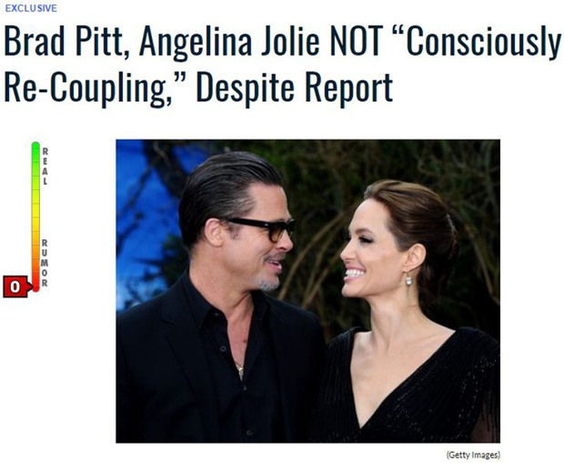 Tuy nhiên, Gossip Cop - trang web chuyên đính chính tin tức về người nổi tiếng - mới đây thì đăng tin rằng, Brad Pitt không hề có ý định tái hợp. Hồi tháng trước, đã có nhiều website và trang báo đưa tin rằng quá trình ly hôn của họ đã được hoãn, tuy nhiên nguồn tin thân cận với hai ngôi sao khi đó tiết lộ với trang Gossip Cop rằng tin tức đó là sai sự thật: "Họ không cân nhắc lại điều gì cả". Vì thế, theo Gossip Cop, tin tức mới nhất về chuyện Brad và Angelina tái hợp càng không có cơ sở.