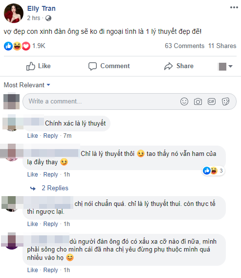 Cô viết: "Vợ đẹp con xinh đàn ông sẽ không đi ngoại tình là 1 lý thuyết đẹp đẽ!". Dòng chia sẻ của Elly Trần khiến nhiều người cho rằng cô đang ẩn ý về việc chồng cô ngoại tình chứ không chỉ là một dòng trạng thái vu vơ.