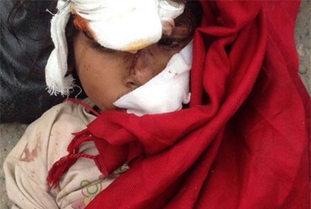 Một em bé bị thương ở đầu và mặt. Nepal từng hứng chịu trận động đất tồi tệ nhất, mạnh 8,0 độ Richter hồi năm 1934. Nó phá hủy các thành phố lớn của nước này gồm Kathmandu, Bhaktapur và Patan. Ảnh: CNN |