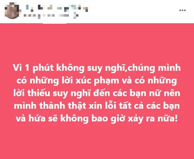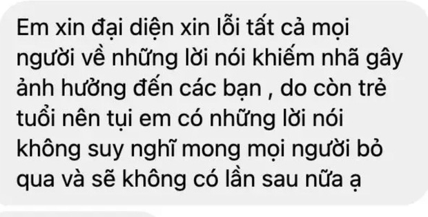"Em xin đại diện xin lỗi tất cả mọi người về những lời nói khiếm nhã gây ảnh hưởng đến các bạn. Do còn trẻ tuổi nên tụi em có những lời nói không suy nghĩ, mong mọi người bỏ qua và sẽ không có lần sau nữa" - Một thành viên trong nhóm cho hay.
