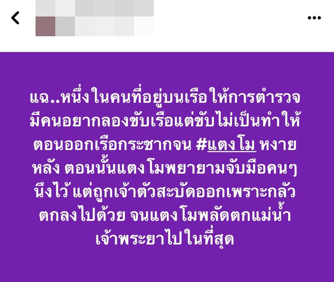 Cụ thể, đối tượng này đã tới trình diện cũng như khai với cảnh sát rằng, ngày hôm xảy ra tai nạn, có một người muốn thử lái thuyền. Thế nhưng do chưa biết lái nên người này đã khiến cho chiếc thuyền bị rung lắc mạnh. Ngay sau đó Tangmo suýt nữa bị ngã ngửa ra sau nhưng kịp thời bám vào tay người này. Tuy nhiên, người này do cũng đang sợ hãi nên đã lập tức hất tay Tangmo ra. Do bị người này hất tay nên Tangmo mới rơi xuống sông Chao Phraya.