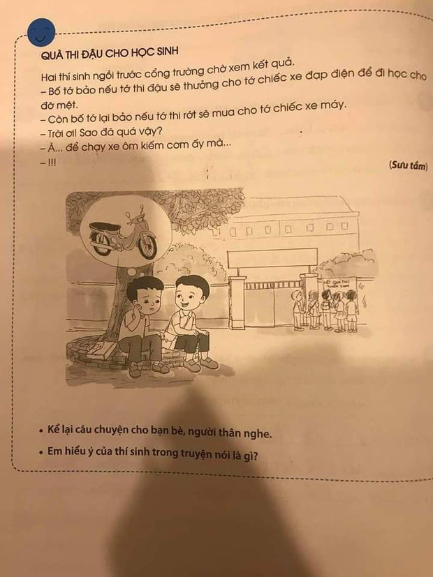 Nhiều phụ huynh đã không khỏi sốc sau khi thấy trang sách này, đặc biệt bài tập còn yêu cầu học trò kể chuyện cho bạn bè và người thân nghe. Phần lớn cho rằng nội dung không phù hợp khi có phần khuyến khích học trò thi trượt, có thái độ phân biệt đối với nghề xe ôm, bên cạnh đó không phải trẻ lớp 2 nào cũng hiểu được ý nghĩa bài học hài hước của câu chuyện.