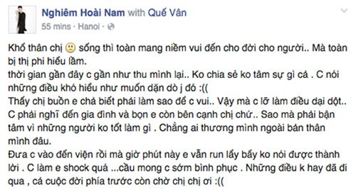 Theo chia sẻ của em trai Quế Vân thì cô nhập viện vì tự tử và vẫn đang trong tình trạng nguy kịch.
