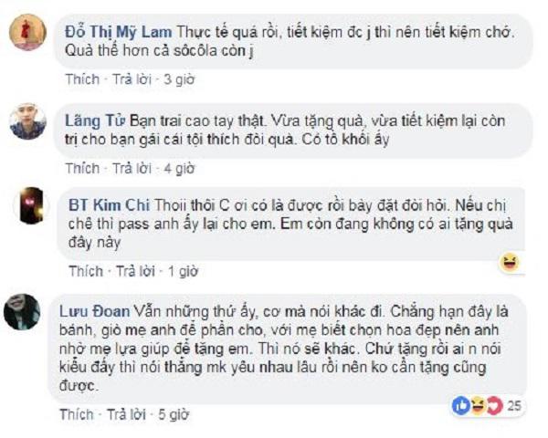 Một thành viên có nickname Lưu Đoan bình luận: "Vẫn những ấy nhưng nói khác đi, chẳng hạn đây là bánh, giò mẹ anh để phần cho em, mẹ biết chọn hoa đẹp nên anh nhờ mẹ lựa giúp để tặng em thì mọi chuyện sẽ khác. Chứ tặng rồi ai lại nói kiểu đấy, hoặc nói thẳng mình yêu nhau lâu rồi nên không cần tặng quà cũng được".