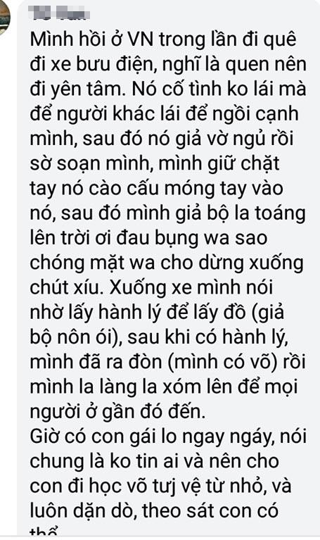 Xuống xe mình nói nhờ lấy hành lý để lấy đồ (giả bộ nôn ói). Sau khi có hành lý, mình đã ra đòn (mình có võ) rồi mình la làng la xóm lên để mọi người ở gần đó đến. Giờ có con gái lo ngay ngáy, nói chung là không tin ai và nên cho con đi học võ tự vệ từ nhỏ. Luôn dặn dò, theo sát con có thể. Ở nước ngoài không cần kiểm tra tinh trùng nhé, bị tố một phát là xong đời nhé".