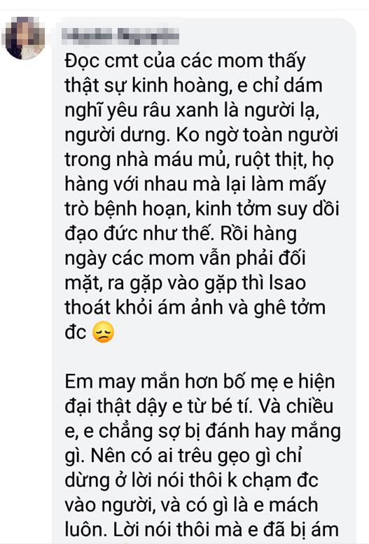 Thành viên P.N căm phẫn lên tiếng: "Mình bị chú họ xâm hại một thời gian dài nhưng mình lúc đó không biết như vậy là bị xâm hại". Chung dòng cảm xúc, bạn T.M.M nhớ lại: "Mình bị bác ruột xâm hại lúc 7 tuổi, nhớ hoài các mẹ à". Còn bạn Đ.M.P cũng đau đớn: "Có những chuyện không bao giờ dám nói ra, nó như một vết cắt trong lòng mà không ai có thể chữa lành. Là nỗi sợ không ai có thể khiến mình chấm dứt. Cả đời không bao giờ có thể quên được, chỉ thấy sợ hãi và kinh tởm".