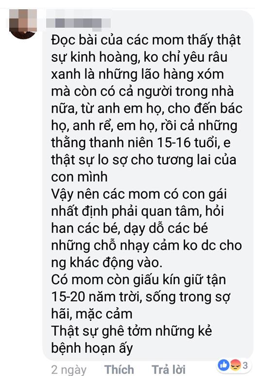 Đi sâu vào đọc comment của các mẹ, mới thấy giật mình bởi đối tượng xâm hại không chỉ là những người lạ đi cùng xe, những người ít có cơ hội tiếp xúc với nạn nhân. Đáng ngại hơn, đó lại là những người thân quen cùng nhà, từ anh em họ cho đến bác họ, anh rể, rồi cả những đối tượng thanh niên choai choai 15 - 16 tuổi.