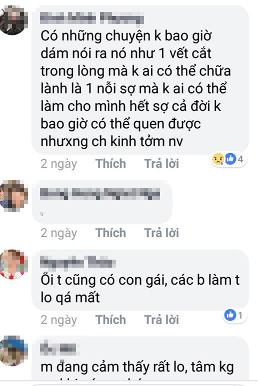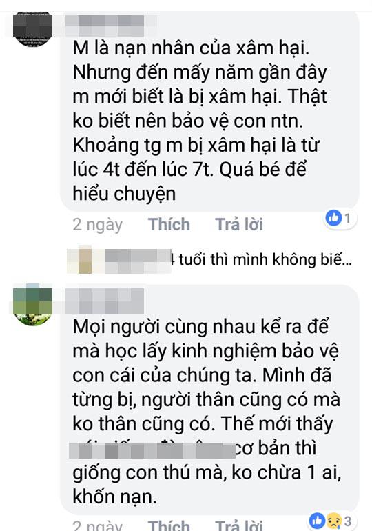 Thành viên có tên O.C trải lòng: "Mình là nạn nhân của xâm hại. Nhưng đến mấy năm gần đây mới biết là bị xâm hại. Thật không biết nên bảo vệ con như thế nào. Khoảng thời gian mình bị xâm hại là từ lúc 4 tuổi đến lúc 7 tuổi. Quá bé để hiểu chuyện".