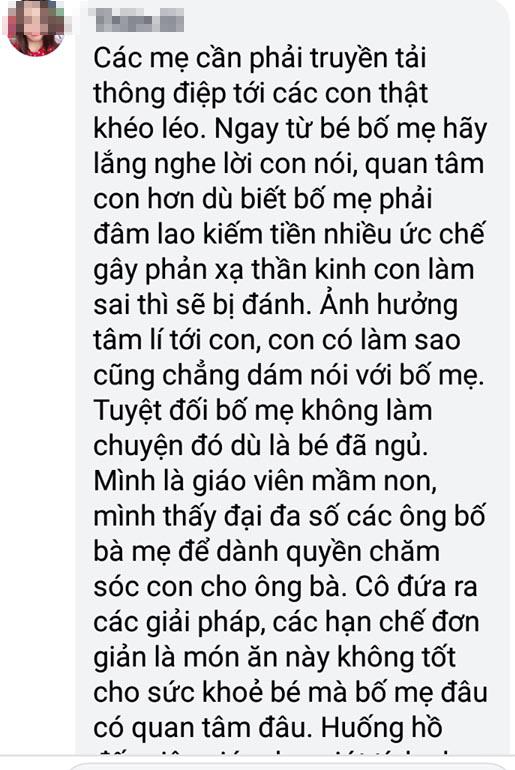Còn một cô giáo mầm non, cũng là thành viên diễn đàn tên T.D dốc bầu tâm sự: "Các mẹ cần phải truyền tải thông điệp tới con thật khéo léo. Ngay từ bé bố mẹ hãy lắng nghe lời con nói, quan tâm con hơn. Dù biết bố mẹ phải lao đi kiếm tiền, nhiều ức chế gây phản xạ thần kinh. Con làm sai sẽ bị đánh. Điều đó gây ảnh hưởng tâm lý tới các con, khiến con có làm sao cũng chẳng dám nói với bố mẹ. Tuyệt đối bố mẹ không làm chuyện đó dù là bé đã ngủ".