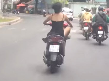 Hơn nữa, cô liên tục rồ ra vượt trái, vượt phải, chân gác vào yếm xe phía trước bất chấp an toàn. Cô còn chửi bới những người chạy xe cùng chiều và thản nhiên mặc kệ mình bị lộ nội y.