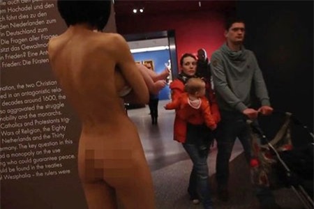 Một nữ nghệ sĩ người Thụy Sĩ mới đây đã gây sốc tại một bảo tàng ở Đức sau khi bế một đứa bé đi dạo xung quanh nơi này trong tình trạng hoàn toàn khỏa thân.