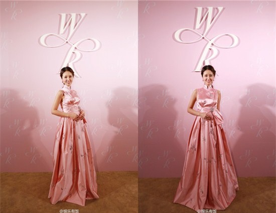 Cuối buổi tiệc, Lâm Tâm Như thay chiếc đầm màu hồng nhạt cùng chú rể tiếp khách.