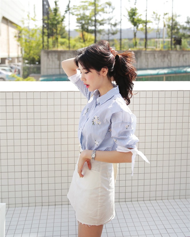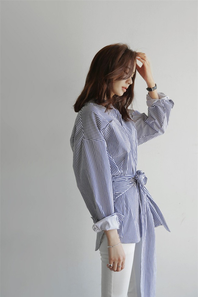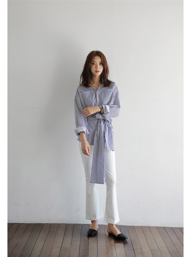 Những kiểu dáng sơmi kẻ sọc cách điệu với điểm nhấn thắt nơ ở eo vừa thời thượng lại vừa giúp các nàng khoe khéo vòng eo của mình.