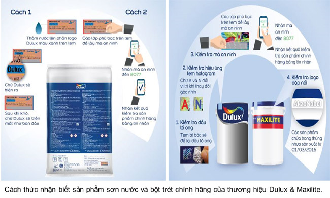 Anh Ngô Tấn Phát - một nhà thầu chuyên nghiệp tại huyện Hóc Môn chia sẻ: “Xét về tem chống giả, thì tem của thương hiệu sơn Dulux và Maxilite là thông minh và hiệu quả nhất dành cho cả bột trét và sơn nước. Với bột trét, tem sẽ được dán ở mặt sau và khi thoa nước lên sẽ xuất hiện dòng chữ Dulux. Với sơn nước, mỗi hộp sơn sẽ có 2 tem chống giả dán đối xứng nhau, khi bốc tem sẽ để lại vết tổ ong trên tem và vỏ lon; hay cách kiểm tra hiệu ứng đặc biệt của tem lúc thay đổi góc nhìn, chữ A trên tem sẽ biến thành chữ N. Đặc biệt nhất chính là kiểm tra mã an ninh sau lớp cào trên tem chống giả, sau đó gửi về tổng đài của công ty để xác nhận. Các cách thức này không thể làm nhái theo nên khách hàng rất dễ phân biệt được hàng thật - giả của thương hiệu Dulux và Maxilite”.
