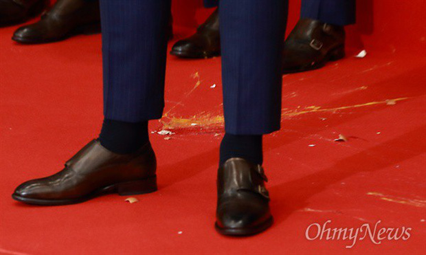 Rất bất ngờ, tiền đạo đang chơi cho Tottenham bị một cổ động viên quá khích ném trứng vào người. Tình huống diễn ra quá nhanh khiến Son Heung-min không kịp phản ứng, dù vậy chân sút có 2 pha lập công tại World Cup 2018 vẫn hoàn thành bài diễn văn.