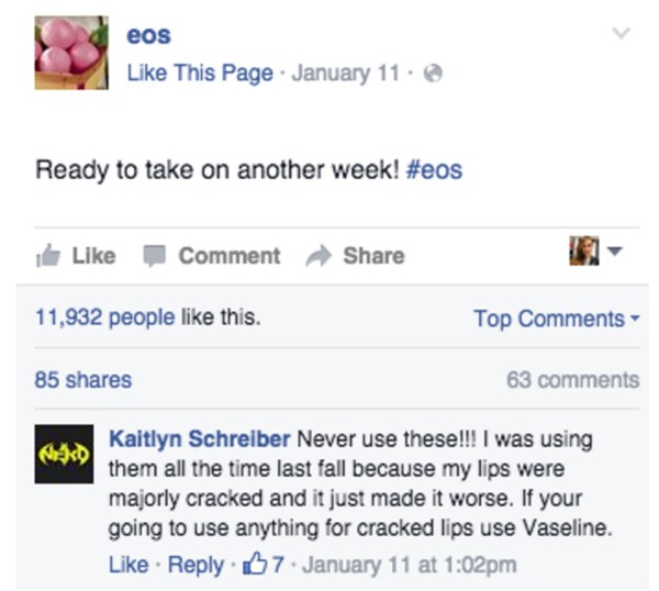 Trên mạng xã hội, nhiều người dùng khác cũng nhanh chóng chia sẻ về việc son trứng EOS đã gây dị ứng cho họ ra sao, nhẹ thì gây khô rát môi, nặng thì gây phát ban, phồng rộp. Một số khách hàng đã than phiền trực tiếp trên trang Facebook của EOS và cảnh báo những khách hàng khác.