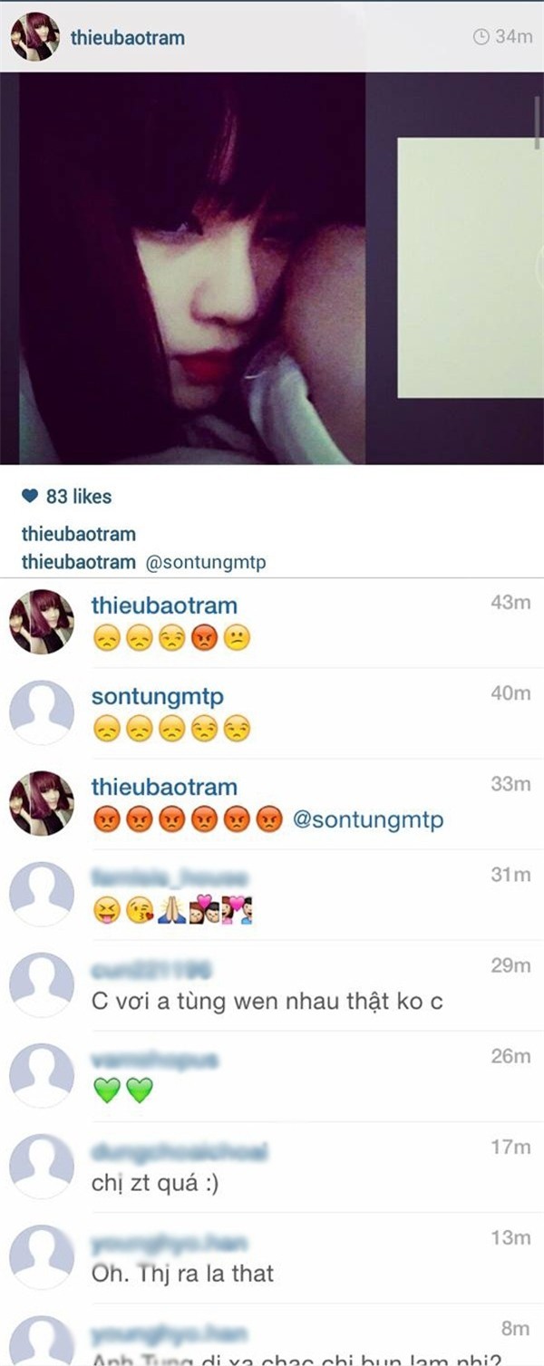 Nghi án tình cảm của Sơn Tùng MTP và Thiều Bảo Trâm xuất hiện từ đầu năm 2014 khi cả hai liên tiếp tag nhau trên Instagram cá nhân. Các fan liên tục "điều tra" và thấy nhiều điểm đáng nghi ở Instagram cả hai nhân vật chính. Khi Sơn Tùng đi lưu diễn nước ngoài, Thiều Bảo Trâm liên tục đăng tải tâm trạng nhớ nhung người yêu ở xa. Hoặc hình ảnh bàn tay đan vào nhau hay ảnh đằng sau một chàng trai ôm Thiều Bảo Trâm, nhiều fan cứng của Sơn Tùng đều xác nhận đó chính xác là Sơn Tùng. Thậm chí, các fan còn "soi" được cả hai nhân vật chính đều đeo nhẫn đôi giống nhau.