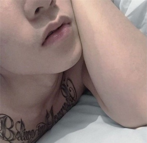 Một góc ảnh nhìn thấy rõ ký tự tiếng Anh nằm trong dòng chữ “Believe in yourself” trên ngực Sơn Tùng.