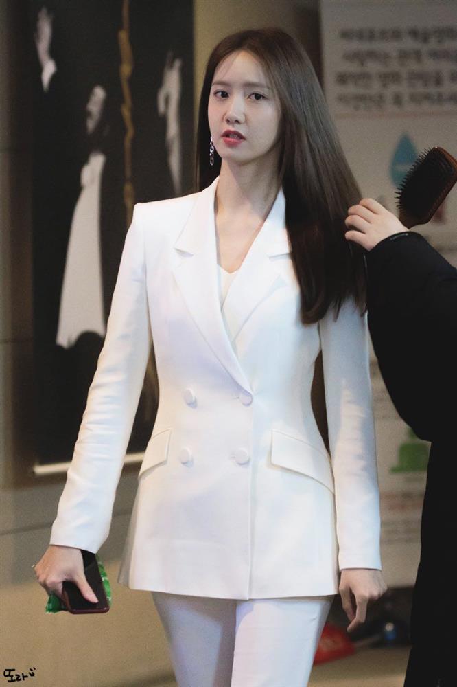 Thiết kế áo blazer và quần âu đồng bộ, Yoona còn diện thêm cùng giày cao gót trắng mũi nhọn tạo cảm giác thanh lịch, chỉn chu.