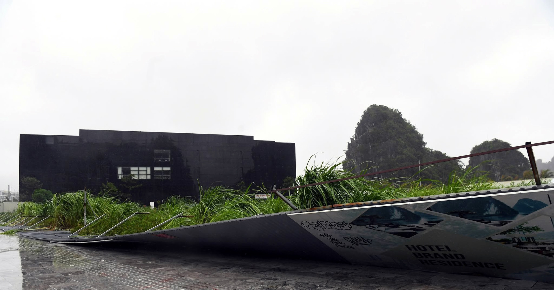 Người dân đi xe máy gần khu vực bờ biển Quất Lâm lúc bão số 3 đổ bộ vào khu vực đất liền. Ảnh: Trọng Tùng