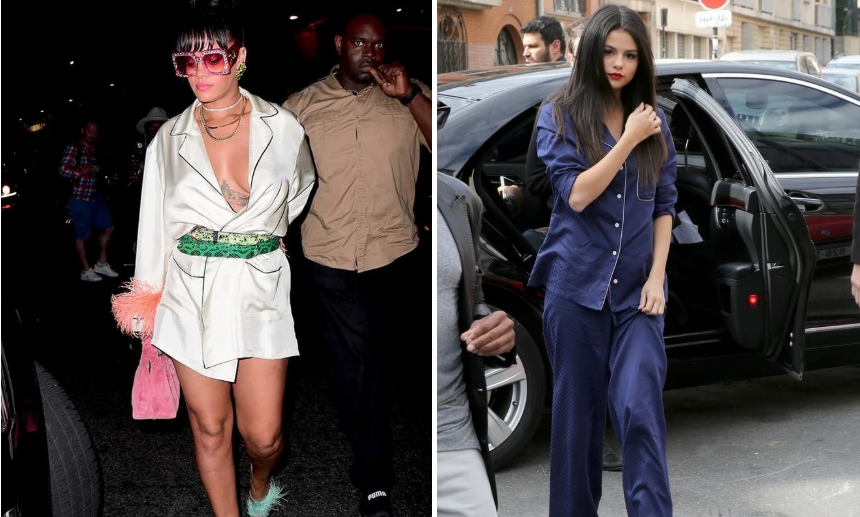 Rihanna mê mẩn xu hướng mặc đồ ngủ và giày cao gót. Cô từng diện chiếc áo choàng lụa kết hợp đôi dép cao gót mềm mại tại bữa tiệc sau Met Gala năm 2017. Trong khi đó, Selena Gomez cũng chuộng trang phục thoải mái này khi ra phố.