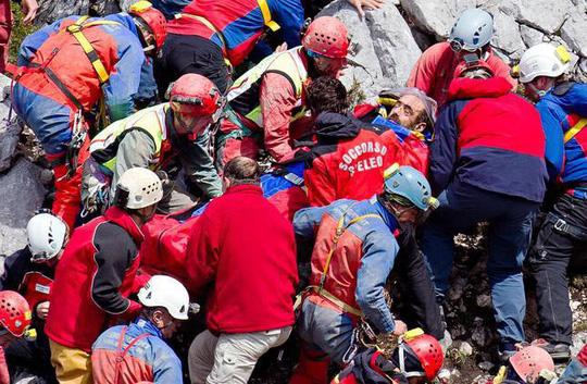 Lực lượng cứu hộ đưa nhà thám hiểm hang động Johann Westhauser ra khỏi hang và chuẩn bị đưa lên trực thăng tới bệnh viện. Ảnh: AP