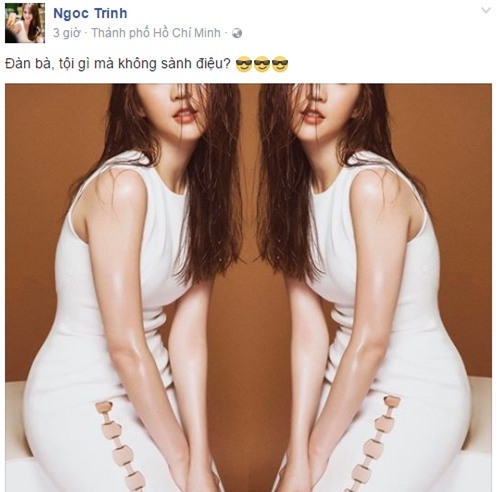 Sau vài giờ đăng tải, dòng trạng thái của Ngọc Trinh đã nhanh chóng thu hút sự quan tâm từ phía cộng đồng mạng. Bên cạnh những lời ngợi khen dành cho nhan sắc ngày càng xinh đẹp của cô gái sinh năm 1989 thì không ít người đồng tình với quan điểm của người đẹp rằng, “đàn bà nên sành điệu chút” để làm mới bản thân.