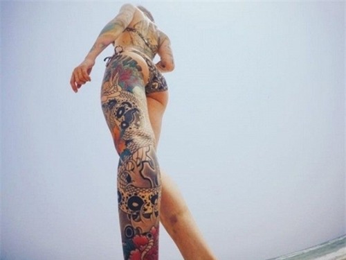 | Phương Anh nổi lên từ năm 2015 với loạt ảnh khoe thân hình toàn hình xăm trên bãi biển Nha Trang. |