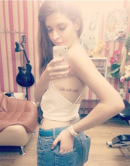 | Andrea Aybar xăm dòng chữ nhỏ ngay phía lườn ngực. |