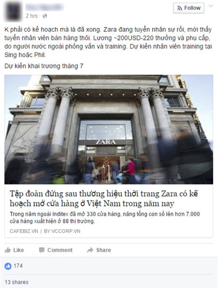 Tiết lộ bên lề của một Facebooker về việc Zara mở cửa hàng tại Việt Nam. |