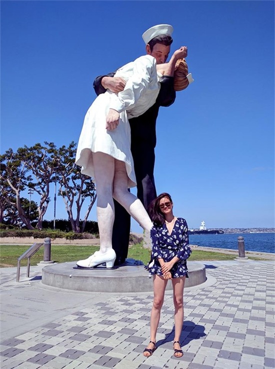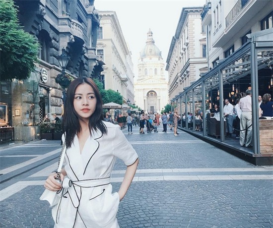 Khi đi du lịch nước ngoài, Minh Hằng khôn ngoan lựa chọn chân váy đỏ, áo trắng và phụ kiện hàng hiệu sành điệu."Công thức" phối đồ thời thượng và luôn giúp chủ nhân bắt mắt.