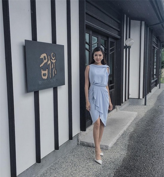 Á hậu Thúy Vân yêu thích chiếc váy mềm mại và điệu đà màu xanh thanh bình kết hợp giày cao gót. Khi đi hẹn hò hay dự tiệc thì đây là style rất lý tưởng để học hỏi.