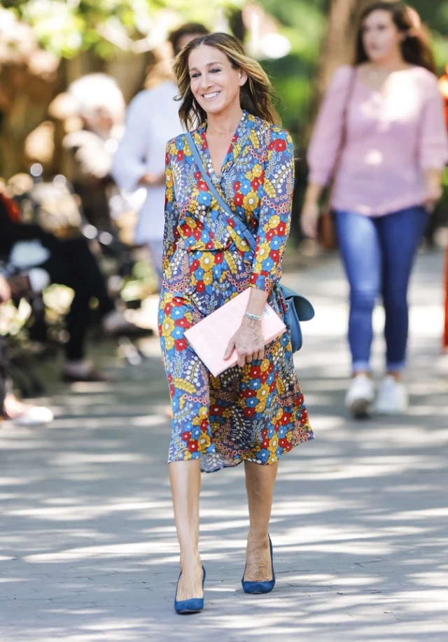 Nữ diễn viên cũng không bỏ qua yếu tố tôn dáng khi lên đồ. Cụ thể, Sarah Jessica Parker thường ưu tiên váy dài nhấn eo, váy cổ chữ V để tạo hiệu ứng vóc dáng cao ráo hơn. Để đảm bảo sự sang trọng, hài hòa cho các set váy họa tiết, Sarah Jessica Parker chọn những mẫu giày như sandal hay giày cao gót mũi nhọn.