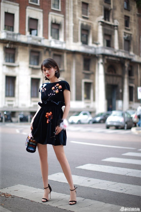 nàng này lựa chọn một chiếc váy nhung với điểm nhấn đính hoa nổi 3D rất