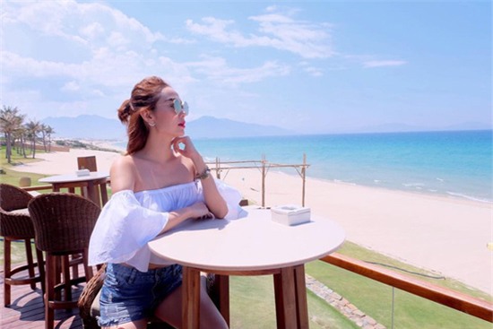 Minh Hằng gợi ý cho các bạn gái đi biển áo trễ vai, quần shorts jeans. Đây là haimón đồ không thể thiếu của mọi cô nàng cho chuyến đi nghỉ mát. Style này sẽ khiến chủ nhân gợi cảm, trẻ trung và đáng yêu.