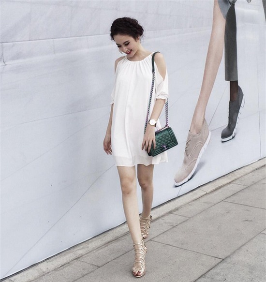 Những chiếc váy điệu đà, nữ tính rất được các ngôi sao nữ Việt ưa chuộng trong street style tuần qua. Angela Phương Trinh cũng lựa chọn một chiếc váy trắngdáng xuống hở vai thời thượng. Bộ phụ kiện gồm xăng đan dây, túi Chanel,đồng hồ là không thể thiếu để khẳng định diện mạo sành điệu.