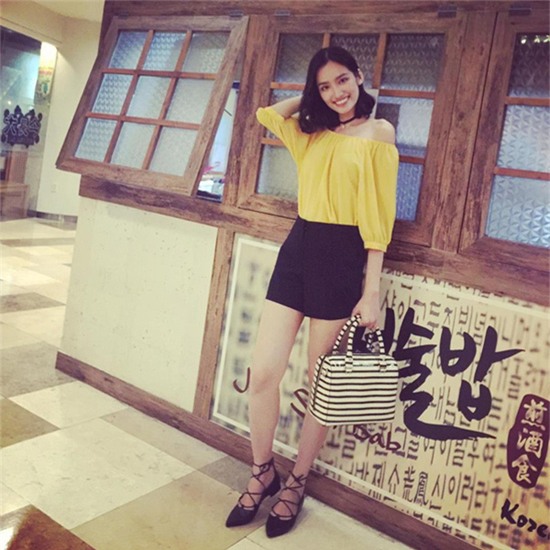 Ngoài những bộ váy áo điệu đà, quần shorts cũng được sao việt ưu ái ngày nắng.Trúc Diễm xinh đẹp với áo trễ vai vàng và quần shorts đen. Chiếc túi kẻ sọcgiúp cô thêm ấn tượng.