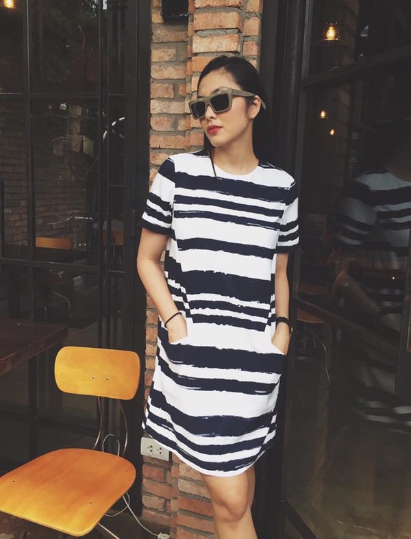 Hà Tăng diện đầm kẻ ngang trắng navy dáng suông nhẹ, đeo kính gọng nhựa đơn giản nhưng đẳng cấp và sành điệu đầy sức hút.
